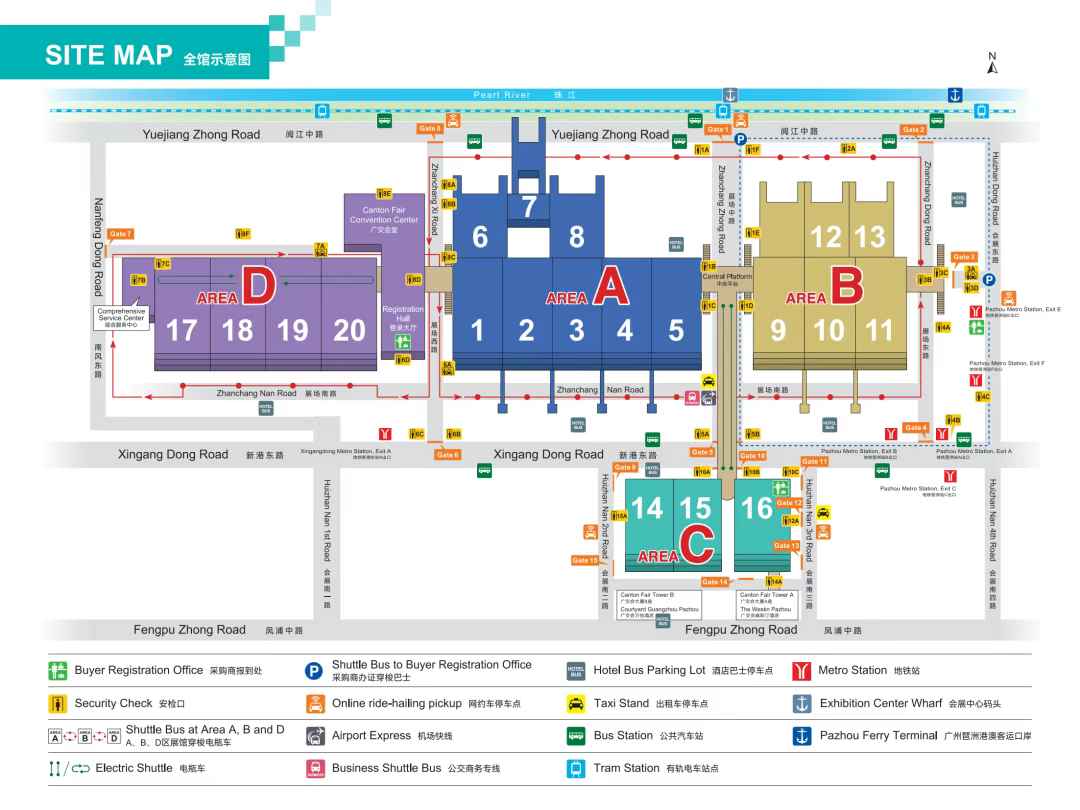 全馆示意图涵盖采购商报到处、安检口、周边交通等信息,选择最近进馆入口更便捷。