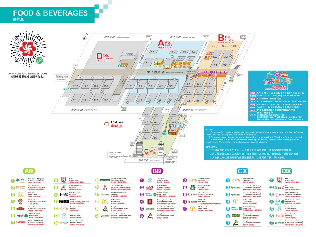 广交会各区均设有餐饮点,品种丰富,浏览餐饮点布局图,尽享各式风味。